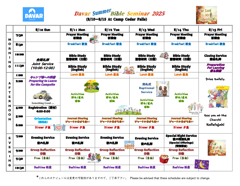 Summer Bible Seminar 2025  “The Lord is My Shepherd” will be held on 8/10 (Sun) – 8/15 (Fri) at Camp Cedar Falls. Now Accepting Applications!